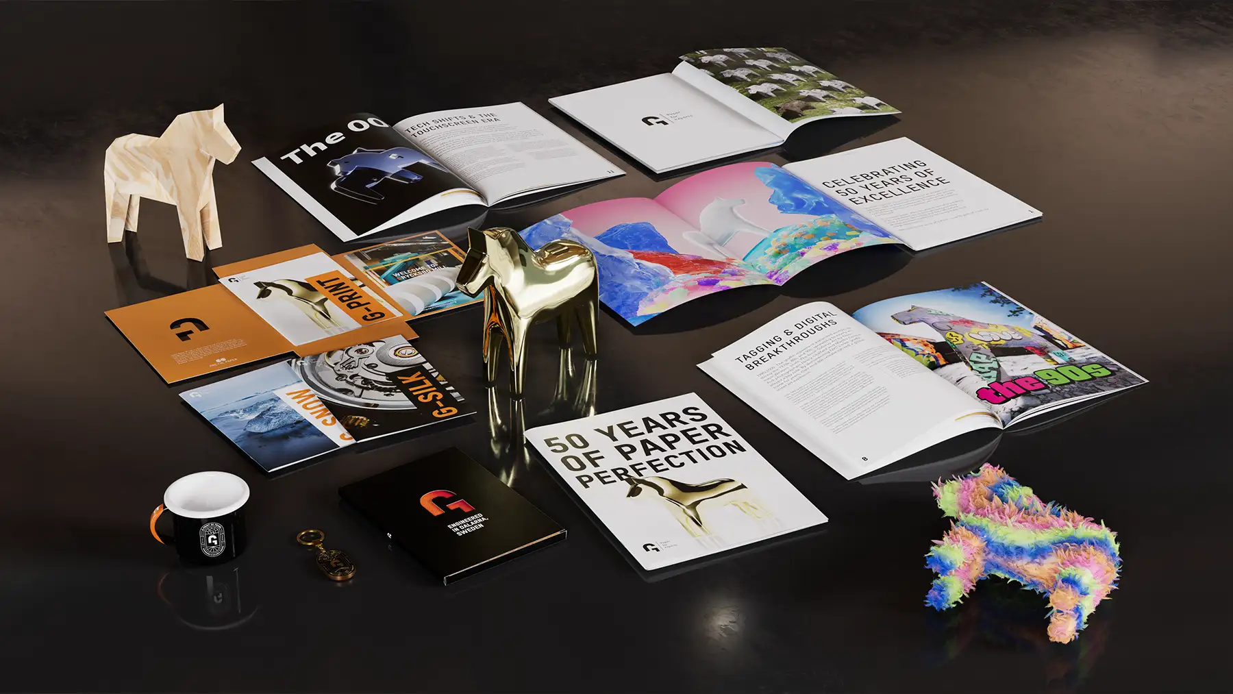 Jubileumskampanjen frontas av G-Prints symbol: dalahästen. Den omisskännliga siluetten fick nya uttryck i form av 3D-skapade skal och ytor, där varje variant speglar stora händelser, trender och tekniska genombrott från de sex decennier som förflutit sedan G-print började producerats 1975. De 3D-animerade materialen lyfter fram G-Prints unika förmåga att återge bild och text med otrolig skärpa. Dalahästarna väcker igenkänning och nostalgiska minnen för oss som hängt med lika länge som pappret, och för dig som gillar nostalgi.
